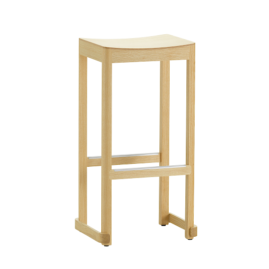 Der Atelier Barhocker ist ein schlichter Hocker aus Massivholz, der von präziser Handwerkskunst zeugt. Mit einem Gewicht von etwa vier Kilogramm ist er leicht und kompakt. Dank seiner geringen Stellfläche und schlanken Proportionen lässt er sich leicht bewegen, während sein symmetrisches Design ein flexibles Sitzen in jeder Ausrichtung ermöglicht. Der Atelier Barhocker besteht aus geometrischen Linien, die sanft durch die Rundungen der Sitzfläche und die Verbindungsstangen, die sich um die Holzbeine schmiegen, unterbrochen werden. Mit Fussstützen, die durch massive Aluminiumeinlagen verstärkt sind, ist er ebenso robust wie vielseitig und auf Langlebigkeit ausgelegt. Er wird in Italien aus heimischen Holzarten hergestellt und ist auch als Thekenhocker mit 65cm Sitzhöhe erhältlich.