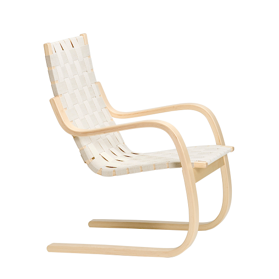 Der Sessel 406 von Alvar Aalto verbindet schlichte Eleganz mit Komfort. Da Holz im Laufe der Zeit Veränderungen unterliegt, werden die Armlehnen aus einem einzigen Stück gefertigt, das anschließend in zwei Hälften geteilt wird, sodass der Sessel auch mit zunehmendem Alter seine perfekte Balance behält. Der freitragende Rahmen aus Birkenholz und die Sitzfläche aus Leinengewebe bieten ein hohes Mass an Komfort und Entspannung. Die natürlichen Materialien passen sich dem Körper an und sorgen gleichzeitig für Festigkeit und Stabilität. Diese Kollektion umfasst ebenfalls eine Liege Lounge Chair 43 und einen Stuhl (Chair 611).