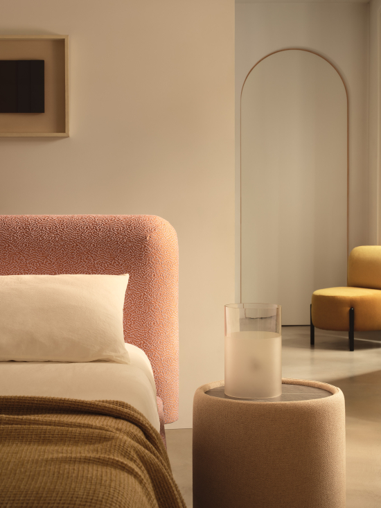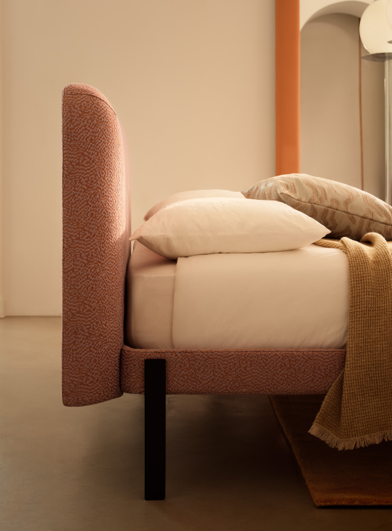Das Design von Joy wird durch den Kontrast zwischen vollen Volumen und leichten Details betont: die schlanken, geometrischen Beine, erhältlich in lackiertem Metall oder mit individuellen Oberflächen, sorgen für ein ausgewogenes Proportionsspiel, verleihen der Struktur optische Leichtigkeit und schaffen eine schwebende, elegante und zeitgemässe Anmutung. Mit seiner glamourösen, modernen und zugleich anspruchsvollen Ästhetik verwandelt Joy das Schlafzimmer in einen stilvollen Rückzugsort, in dem Design und Komfort in einem harmonischen Zusammenspiel von Funktionalität und Schönheit aufeinandertreffen.