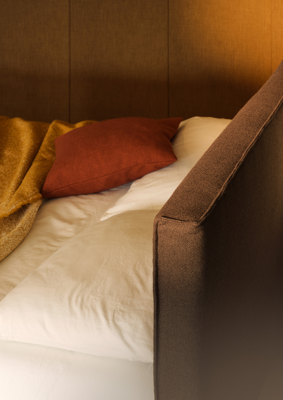 Metropolitan ist ein gepolstertes Bett mit klaren Linien und ausgewogenen Proportionen, das sich mühelos in unterschiedliche Kontexte einfügt – vom privaten Wohnraum bis hin zur gehobenen Hotellerie. Die präzise Geometrie des Rahmens tritt in einen Dialog mit weichen Oberflächen und erzeugt ein Gefühl von Ordnung, Geborgenheit und visueller Kontinuität.