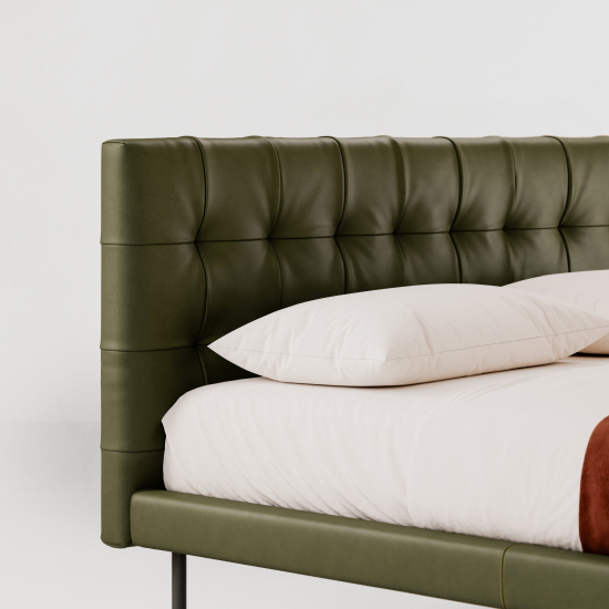 Das Metropolitan Deluxe Bett ist ein gepolstertes Bett mit ausgewogenen Proportionen und klarer Geometrie. Der Rahmen ist präzise gestaltet und tritt in Dialog mit weichen Oberflächen, was ein Gefühl von Ordnung, Geborgenheit und visueller Kontinuität erzeugt. Das charakteristische Element ist das handgefertigte, kapitoniertes Kopfteil, das dem Bett Tiefe und Rhythmus verleiht, ohne die formale Klarheit zu stören. Das Bett fügt sich mühelos in private Wohnräume oder die gehobene Hotellerie ein.