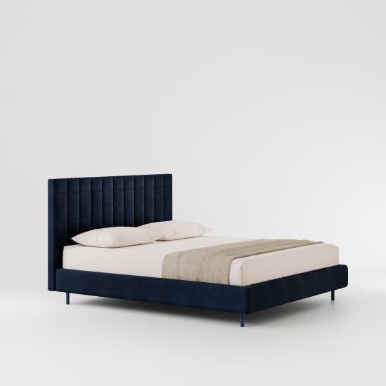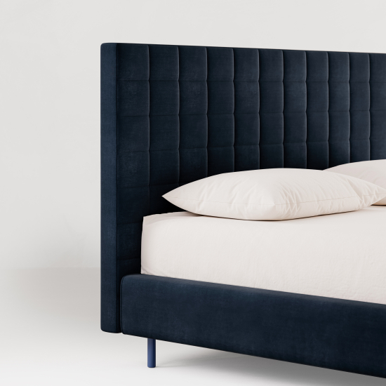 Das Kopfteil zeichnet sich durch einen grafischen Rhythmus quadratischer Module aus, die dem Design eine klassischere, kultiviertere Anmutung verleihen und es zu einem zeitlosen dekorativen Element machen, das dem Raum Eleganz und Persönlichkeit verleiht. Die Nähte betonen die Struktur des Kopfteils und unterstreichen die handwerkliche Präzision und das technische Know-how, die die Identität des Unternehmens ausmachen.