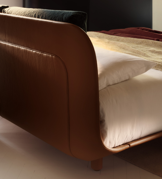 Das Massivholzgestell, lebendig und authentisch, wird mit einem Lederbezug versehen, der mit handwerklicher Sorgfalt angebracht wird und jede Kontur feinfühlig nachzeichnet. Die zurückversetzten, unsichtbaren Füsse lassen das Bett beinahe schwebend wirken – leicht, fast ätherisch. Kopfteil und Bettrahmen sind leicht konkav geformt, um die Matratze sanft aufzunehmen und eine einladende, dezente Präsenz zu schaffen.