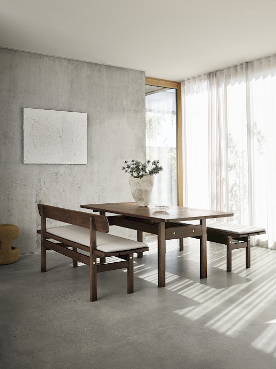 Die Asserbo Bench von Børge Mogensen ist ein hervorragendes Beispiel für ein Design, bei dem der Mensch im Mittelpunkt steht. Es verdeutlicht die Herangehensweise des dänischen Designers an Funktion und Form. Die perfekt proportionierte Sitzfläche aus massivem, dunkel geöltem, FSC®-zertifiziertem Eukalyptusholz hat sanft abgerundete Kanten und sichtbare Schrauben aus gebürstetem Messing. Erhältlich mit einer festen oder einer an der Wand befestigten Rückenlehne sowie mit Kissen aus Leder oder Stoff, wirkt das individualisierbare Design einzigartig und zeitlos.