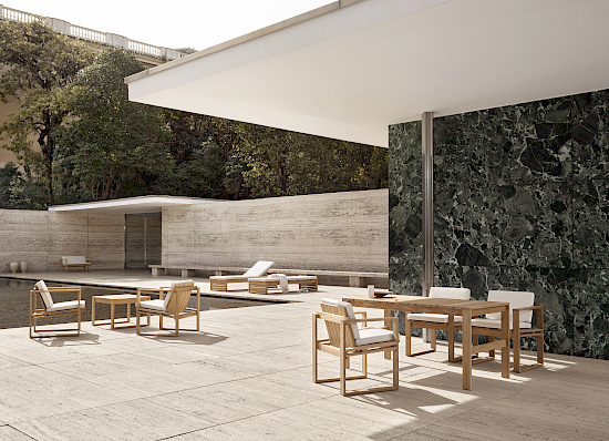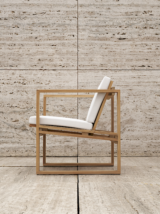Der BK11 Lounge Chair wurde im Jahr 1959 von der dänischen Architektin Bodil Kjær als Teil ihrer architektonisch inspirierten Indoor-Outdoor Series entworfen. Die solide Teakholzkonstruktion des Stuhls hat eine lineare Form, die vom Kubismus beeinflusst ist. Er ist so konzipiert, dass er mit zunehmendem Alter und durch Gebrauch wunderschön patiniert. Der Sitz und die Rückenlehne des Stuhls sind bequem gewinkelt, und er hat Armlehnen, Beine und Kufen, die zwei Quadrate bilden – das Resultat erstklassiger Handwerkskunst. Für zusätzlichen Komfort kann der Lounge Chair mit eleganten Auflagen aus witterungsbeständigem Sunbrella-Stoff ausgestattet werden. Neben dem Loungessessel umfasst die Indoor-Outdoor Series von Kjær auch einen Stuhl, einen Beistelltisch, einen Esstisch, ein Zweisitzer-Lounge-Sofa, ein Schaukelsofa und eine Sonnenliege. Für alle Sitzgelegenheiten, Stühle und Liegen sind elegante Auflagen aus witterungsbeständigem Sunbrella-Stoff erhältlich.