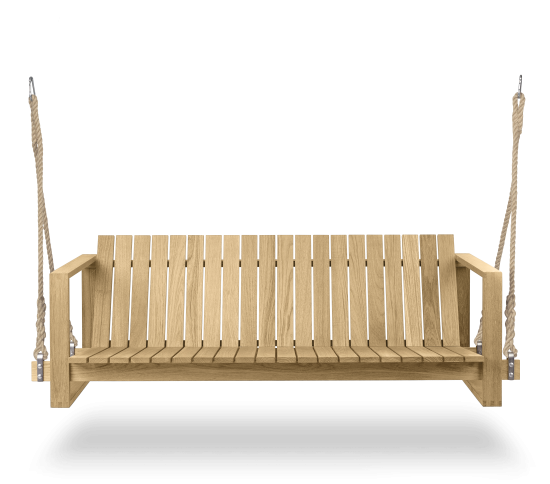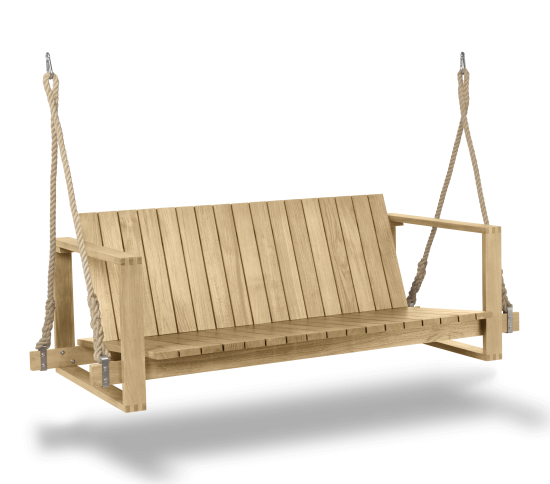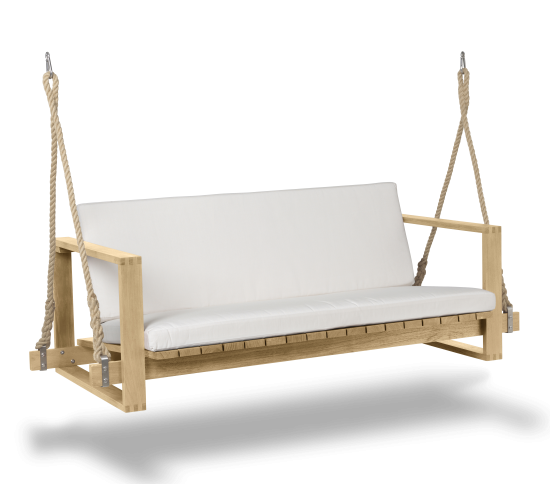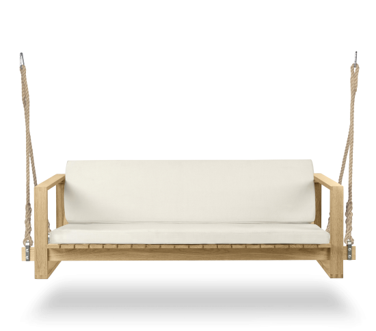 Das BK13 Swing Sofa wurde im Jahr 1959 von Bodil Kjær als Teil einer Serie mit hervorragend gefertigten, architektonisch inspirierten Möbeln für den Innen- und Aussenbereich entworfen. Wie auch bei den übrigen Möbelstücken der Serie liess sich die dänische Architektin vom Kubismus inspirieren, um die präzise, geradlinige Form des Sofas aus massivem Teakholz zu entwerfen. Das Swing Sofa wurde entwickelt, um rauem Wetter standzuhalten. Es ist an geknüpften Seilen aufgehängt, die für eine entspannende Schaukelbewegung sorgen, und bietet überragenden Komfort. Für eine einfache Aufhängung ist es mit einem A-Rahmen lieferbar. Neben dem Swing Sofa umfasst die Indoor-Outdoor Series von Kjær auch einen Loungesessel, einen Beistelltisch, einen Esstisch, einen Stuhl, ein Zweisitzer-Lounge-Sofa und eine Sonnenliege. Für alle Sitzgelegenheiten, Stühle und Liegen sind elegante Auflagen aus witterungsbeständigem Sunbrella-Stoff erhältlich.