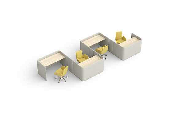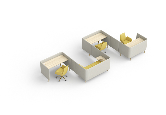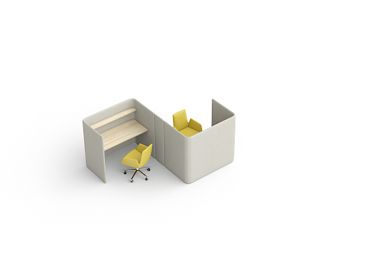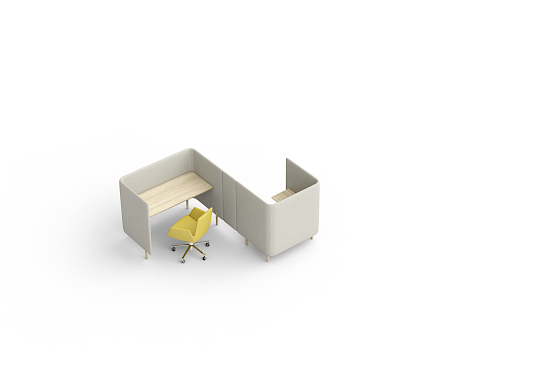 Beim Floater Schreibtisch wird die gepolsterte Aussenschale in Höhen von 86/133 cm wahlweise mit furnierten Tischplatten, pulverbeschichteten MDF-Platten oder HPL-Platten ausgestattet. Zwei Stromanschlüsse sind vorhanden. Die höhere Modellvariante umfasst zusätzlich ein Regal und kann mit indirekter Beleuchtung geplant werden.