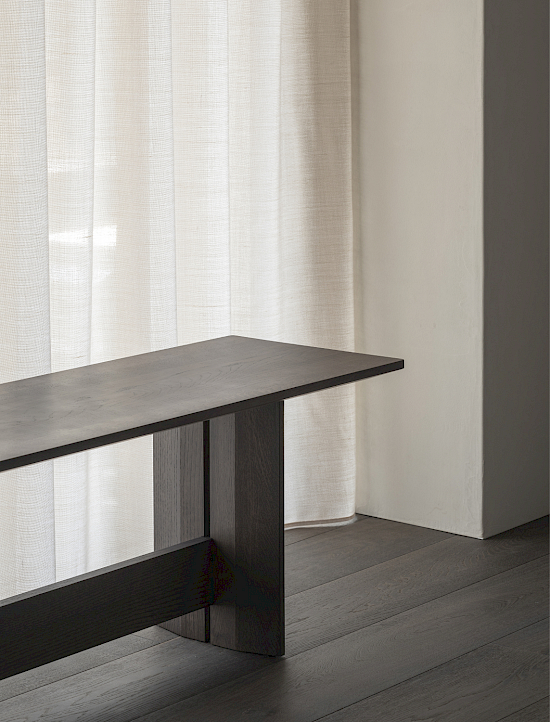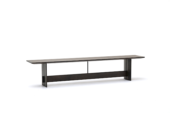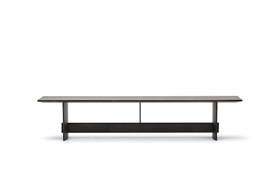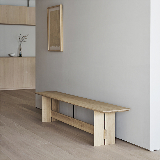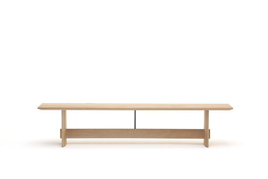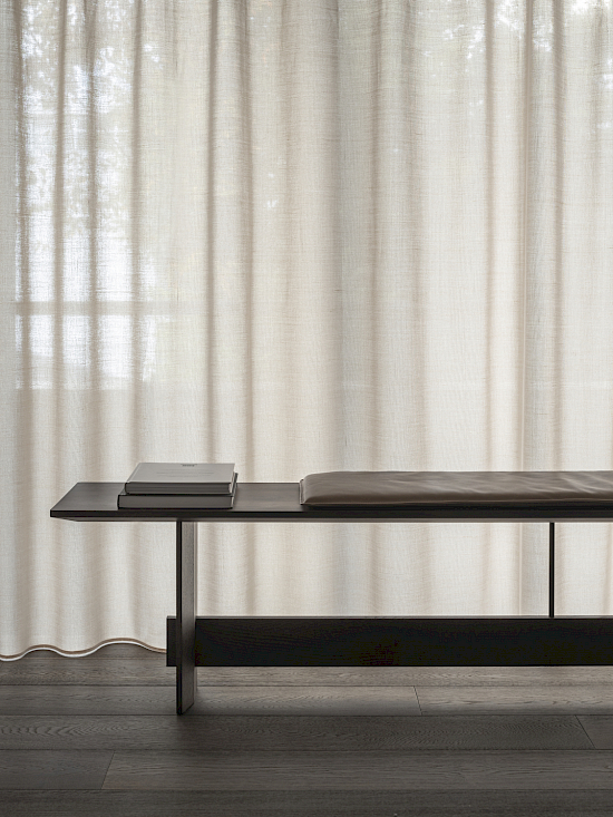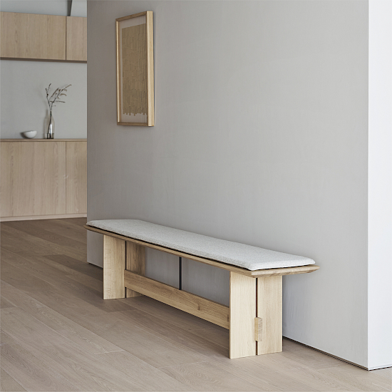 Die Bank wurde als Mehrzweckmöbel entworfen, das sowohl bequem als Sitzgelegenheit als auch ästhetisch als Ausstellungsstück genutzt werden kann. Die dünnen Kanten der Sitzfläche und der Beine verleihen dem Stück ein leichtes und exklusives Aussehen, während die Querstrebe, die mit einer filigranen Stahlstange mit der Sitzfläche verbunden ist, die Konstruktion visuell und funktionell zusammenhält und ein Gefühl der Gesamtharmonie schafft. Das dazugehörige Kissen ist auch separat erhältlich. Die Bank ist in drei Längen erhältlich.