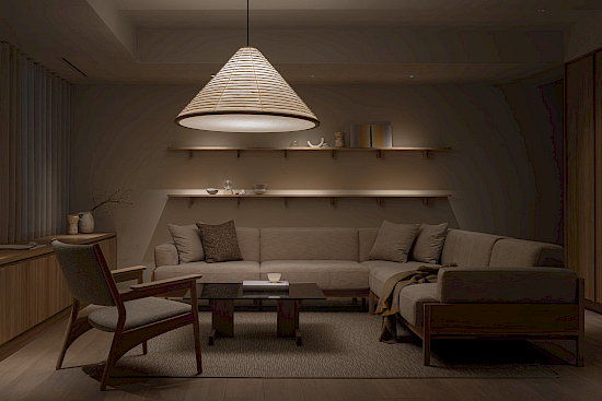 Die Form der Pendelleuchte N-PL01 ahmt die hohe und dreieckige Dachkonstruktion des Archipelago-Hauses an der schwedischen Küste nach. Der Boden der Leuchte ist mit einem einzigen Stück Washi-Papier bedeckt, das von einigen Magneten gehalten wird, so dass man es leicht abnehmen kann, wenn man die Glühbirne auswechseln möchte. Der Boden fungiert ausserdem als Schirm, der die Lichtquelle verbirgt und ein warmes, indirektes Licht erzeugt, das nicht nur nach unten, sondern auch zu den Seiten hin gestreut wird.