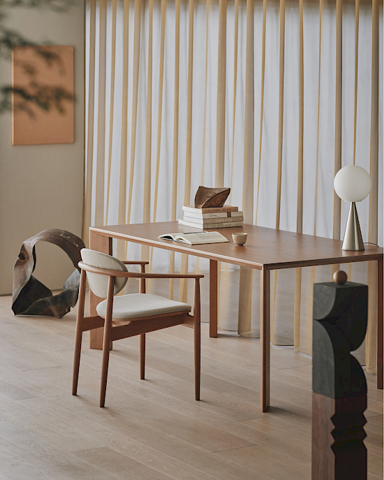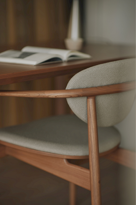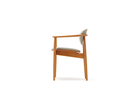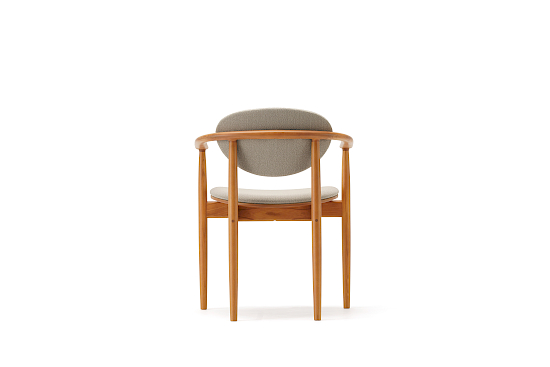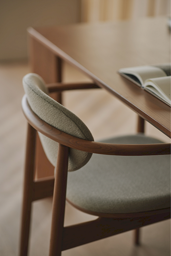 Der abgerundete Vollholzstuhl mit Polsterung A-DC04 lädt dazu ein, beim Essen in entspannter Atmosphäre zu kommunizieren. Mit weichen Textilkissen gepolstert, bieten sowohl die Rückenlehne als auch die Sitzfläche Sitzkomfort und einen Moment der Entspannung. Die dünnen Linien des Massivholzes wirken nie schwer, sondern schaffen eine leichte Atmosphäre rund um den Esstisch.
