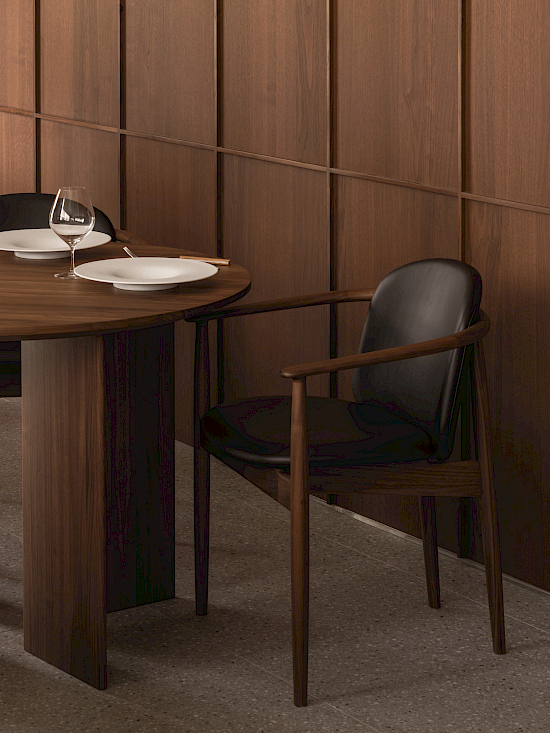 A-DC05 wurde für entspannten Komfort beim Essen im Restaurant entworfen. Sowohl die Rückenlehne als auch die Sitzfläche sind mit weichen Polstertextilien gepolstert und bieten Sitzkomfort und einen Moment der Entspannung. Während die grosse Rückenlehne für eine markante Präsenz und einen privaten Touch im Essbereich sorgt, hinterlassen die schön geschwungenen, dünnen Linien aus Massivholz eine leichte und elegante Atmosphäre.