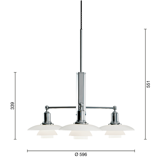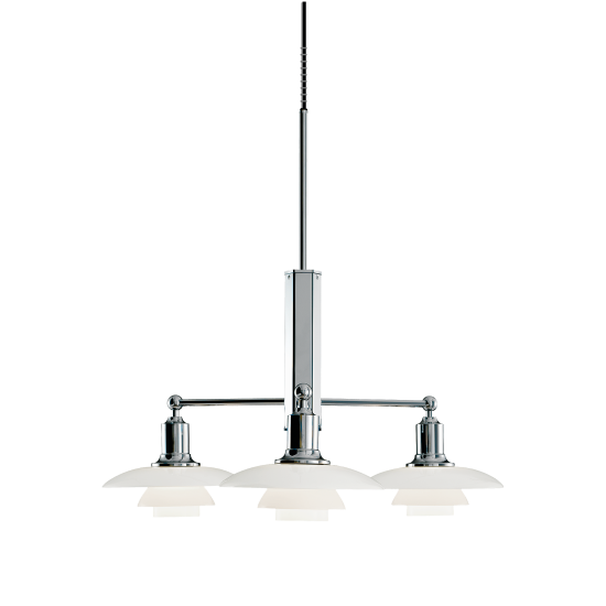 Die Leuchte wurde ausgehend vom Prinzip eines reflektierenden Dreischirmsystems gestaltet, das den grössten Teil des Lichts nach unten leitet. Die Schirme sind aus mundgeblasenem, opalisiertem, dreischichtigem Glas hergestellt, glänzend auf der Aussenseite und auf der Innenseite matt sandgestrahlt, was zu einer weichen und diffusen Lichtverteilung führt.
