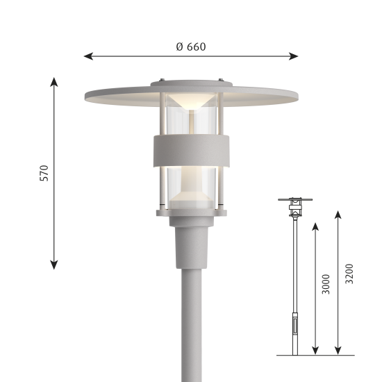 | Montage | Mast-Durchmesser: Ø 60 mm. Übergangsstücke für Masten mit einem Durchmesser von 76 mm bzw. 115 mm sind als Zubehörteile verfügbar. Installationskabel: 4 m, 5 x 1 mm2 Klasse I) oder 4 m, 4 x 1 mm2 (Klasse II). Treiber: In den Leuchtenkopf integriert. |