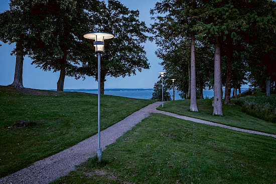 Die Mastleuchte Albertslund Mini wurde 1963 von Jens Møller-Jensen für ein Wohnprojekt im dänischen Albertslund entworfen. Das Produktdesign baut auf einem Abblendring, drei Verbindungsstäben, einem konischen Reflektor und dem Oberschirm auf, der als primärer Reflektor dient. Die LED-Ausführung wurde 2011 auf den Markt gebracht. Die Leuchte strahlt symmetrisches und blendfreies Licht nach unten ab. Der Schirm trägt zur Lichtabstrahlung nach unten bei und verhindert eine Abstrahlung nach oben. Die weissen Reflektoren sorgen für eine diffuse und angenehme Lichtabstrahlung. Der Reflektorring verhindert eine direkte Blendung.
