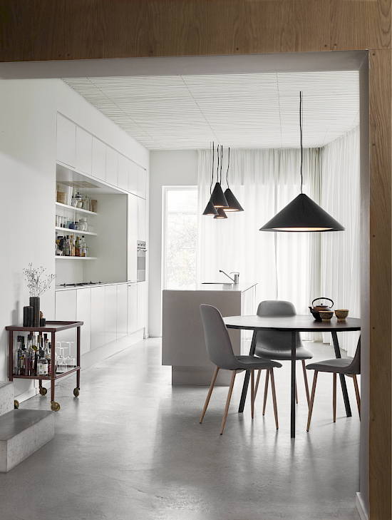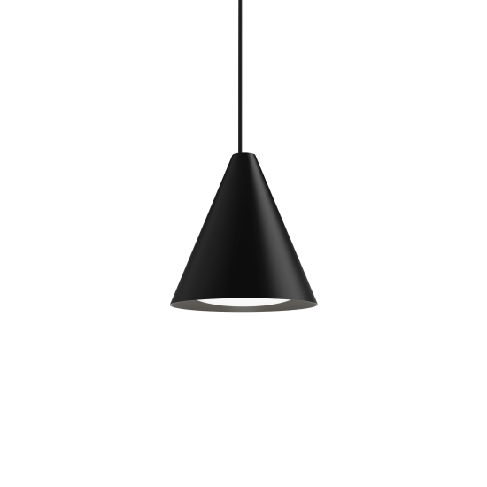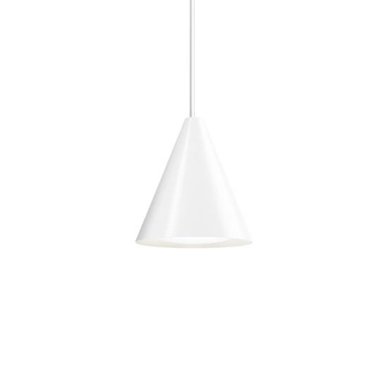 Die markanten kegelförmigen Schirme der Pendelleuchten verfügen über einen gebogenen Opaleinsatz. Dies sorgt für ein angenehmes und blendfreies Licht, das nach unten gerichtet ist. Jede Schirmausführung bewirkt eine charakteristische Lichtstreuung, während die weisse Innenseite das Licht makellos reflektiert. Durch eine gleichmässige, unauffällige Öffnung auf der Schirmoberseite wird zusätzlich ein sanftes Licht nach oben gestrahlt, sodass eine harmonische Atmosphäre entsteht.