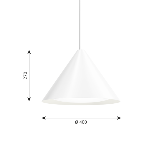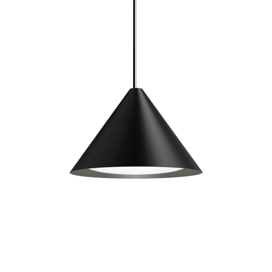 Die markanten kegelförmigen Schirme der Pendelleuchten verfügen über einen gebogenen Opaleinsatz. Dies sorgt für ein angenehmes und blendfreies Licht, das nach unten gerichtet ist. Jede Schirmausführung bewirkt eine charakteristische Lichtstreuung, während die weisse Innenseite das Licht makellos reflektiert. Durch eine gleichmässige, unauffällige Öffnung auf der Schirmoberseite wird zusätzlich ein sanftes Licht nach oben gestrahlt, sodass eine harmonische Atmosphäre entsteht.