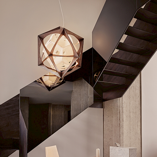 In Kooperation mit Louis Poulsen hat der weltbekannte isländisch-dänische Künstler Ólafur Elíasson eine neue, grosse Pendelleuchte entworfen. Das Ergebnis unterstreicht die gemeinsame Überzeugung von Louis Poulsen und Elíasson, dass gutes Licht für ein gutes Lebensgefühl wichtig ist. Die Pendelleuchte besteht aus zwei gegensätzlichen geometrischen Formen, die ineinander verschachtelt sind. Der äussere Teil des Designs besteht aus einem Aluminiumrahmen, der die Form eines Ikosaeders – also eines Körpers mit 20 dreieckigen Flächen – aufweist. Im Inneren des Rahmens scheint eine weitere Form zu schweben: ein weisses Reflektorteil aus Polycarbonat mit der Form eines Dodekaeders – eines Körpers mit 12 fünfeckigen Flächen. In den Ecken des Aluminiumrahmens sind LEDs angebracht, die mit Lichtleitern an den Innenkanten verbunden sind. Das Licht wird ins Innere der Leuchte auf das Reflektorteil abgestrahlt und von dort in alle Richtungen in die Umgebung reflektiert. Bei der Entwicklung der OE Quasi Light wurde auch auf Nachhaltigkeit geachtet, die ein wesentlicher Bestandteil von Elíassons Arbeit ist. Das verwendete Aluminium besteht zu 90 % aus Recyclingmaterial. Alle anderen verwendeten Materialien können vollständig recycelt werden. Je nach Standort des Betrachters verändert sich das Erscheinungsbild der komplexen geometrischen Form der OE Quasi Light, sodass schier endlose Interpretationen und Perspektiven entstehen.