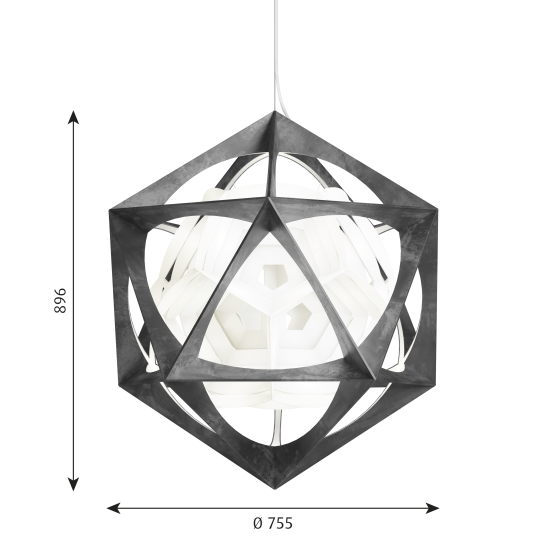 Die Pendelleuchte ist mit zwölf LEDs ausgestattet, die sich im Inneren der Leuchte jeweils an den Eckpunkten des geometrischen Rahmens befinden. Über die Lichtleiter an den Innenkanten sind sie miteinander verbunden, wodurch das Licht gleichmässig in Richtung des Reflektorteils im Zentrum der Leuchte abgestrahlt wird. Das aus weißen Lamellen bestehende Reflektorteil verteilt das Licht in alle Richtungen und ermöglicht so eine blendfreie, gleichmässige Beleuchtung der Umgebung.