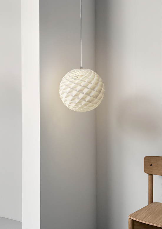 Die kugelförmige Pendelleuchte strahlt einen blendfreien Lichtschein ab, der von den kleinen rautenförmigen Zellen reflektiert wird, aus denen sich die Leuchte zusammensetzt. Durch die Struktur der Leuchte wird sichergestellt, dass das Licht ab einem Blickwinkel von 45 Grad blendfrei ist. Gleichzeitig strahlt die Leuchte nach unten gerichtetes Licht sowie einen Lichtschein nach oben ab, der die Decke beleuchtet und so die Umgebung in eine angenehme Atmosphäre taucht. Jede einzelne Zelle verleiht dem Licht Form. Es entstehen sanfte Übergänge zwischen direktem und reflektiertem Licht, wodurch die bemerkenswerte Strahlkraft der kugelförmigen Leuchte besonders betont wird.