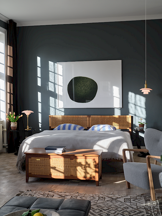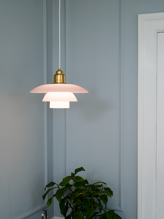 Die PH 3½-3 Pale Rose Pendelleuchte aus Messing fügt sich ideal in die heutige Zeit ein, in der häufig eine diskrete, aber dennoch klare Beleuchtung bevorzugt wird, die ein gemütliches Ambiente schafft. Henningsen hatte ausserdem schon immer eine Schwäche für Blassrosa und dafür, wie die Farbe das Erscheinungsbild einer Leuchte und ihres Lichts verändern konnte. Etwa zur gleichen Zeit schuf er eine besonders dezente Ausführung seiner Septima Glaskrone mit sieben Schirmen: die Rosa Septima. Drei Jahrzehnte später nutzte er den gleichen blassrosa Farbton für die Innenseiten der hübschen Kupferschirme der legendären PH Artichoke. Dank ihrer besonderen Abmessungen passt die PH 3 ½-3 Pale Rose Pendelleuchte aus Messing in fast jeden Raum. Sie ist sehr vielseitig und fügt sich überall dort ideal ein, wo ein stilvolles Design in Kombination mit einer gleichmässig sanften Lichtabstrahlung gewünscht wird. Mit ihren weichen Linien, der einzigartigen Silhouette der Dreischirmleuchte, dem blassrosa Farbton, den klaren Kanten und der weissen, textilumsponnenen Zuleitung sticht die Leuchte aus der Masse heraus. Auch wenn die Leuchte allein schon mit ihrem markanten Erscheinungsbild überzeugt, ist sie noch beeindruckender, wenn mehrere Leuchten in einer Reihe installiert werden und sich die Umgebung in ihren Schirmen aus mundgeblasenem italienischen Glas widerspiegelt.