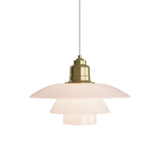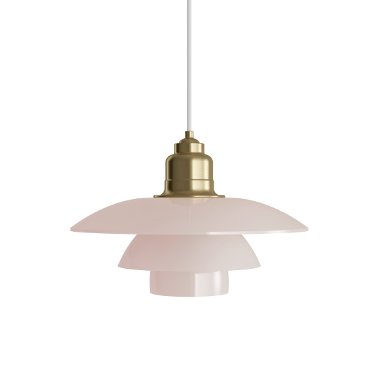 Die Leuchte basiert auf Poul Henningsens renommiertem Dreischirmsystem. Sie reflektiert das Licht nicht nur nach unten, sondern strahlt auch einen sanften Lichtschein ab. Die Schirme aus mundgeblasenem blassrosa Opalglas besitzen eine glänzende Oberseite sowie eine sandgestrahlte, matte Unterseite in Opalweiss. So entsteht eine sanfte, poesievolle Beleuchtung.