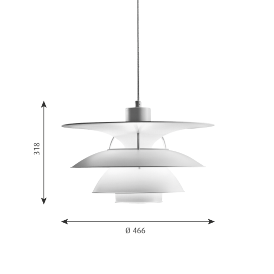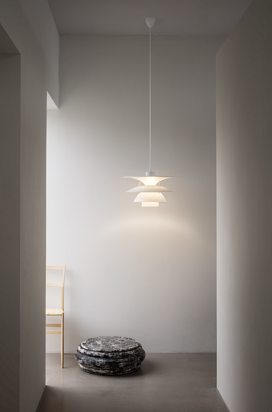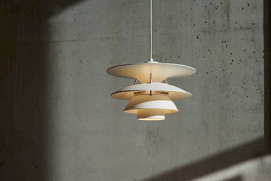 Der trompetenförmige obere Schirm sorgt für die Beleuchtung des Bereichs über den drei Schirmen,die das Licht primär nach unten leiten. Eine Bodenschale und ein Abblendring sichern aus allen Winkeln gegen Blendung ab. Das Licht ist unter der Leuchte am kräftigsten. Die Schirme sind mattweiss beschichtet, was hohen Lichtkomfort gewährleistet.