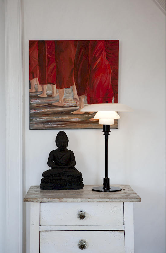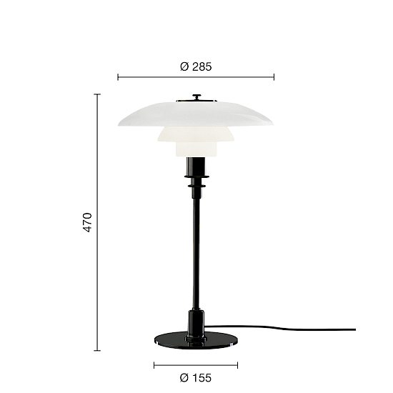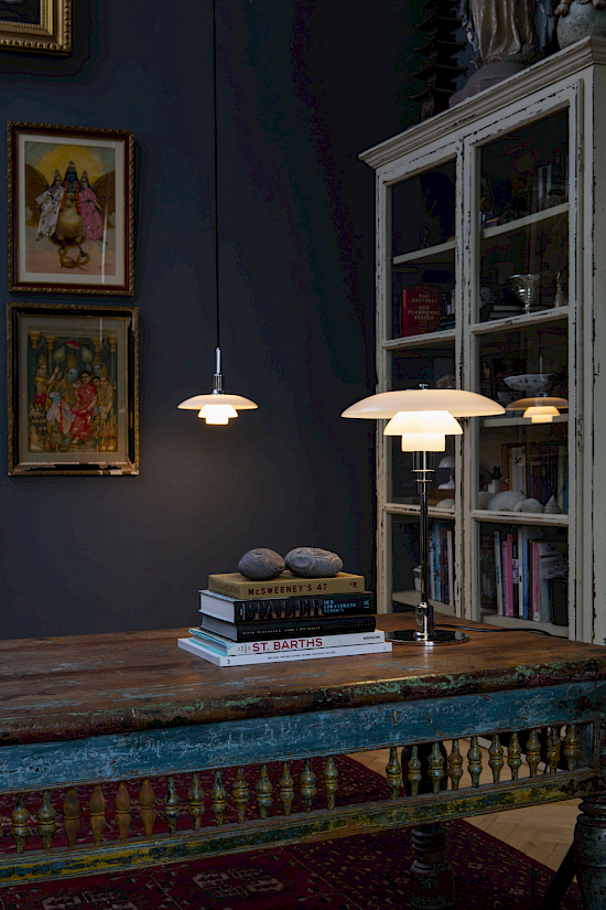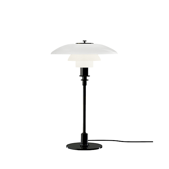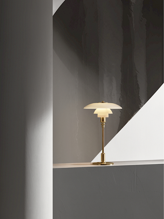 Diese Tischleuchte ist aus mundgeblasenem, dreischichtigem weissen Opalglas gefertigt. Sie strahlt ein weiches, harmonisches und angenehmes Licht ab, das hauptsächlich nach unten gerichtet ist. Als Grundlage für diese Leuchte verwendete Poul Henningsen sein gefeiertes Dreischirmsystem. Entworfen hatte er dieses System 1925 mit dem Ziel, ansprechendem, blendfreiem Licht eine Form zu verleihen. Henningsen verfolgte einen ausgeprägten, wissenschaftlichen Beleuchtungsansatz und entwarf auf Grundlage dieses Systems weitere Designs. Mit dem auf der Lituus-Kurve basierenden Dreischirmsystem erreichte er eine gleichmässige Lichtabstrahlung. Zudem wird das Licht durch das Glas gestreut, wodurch einem Blendeffekt und Schattenwurf entgegengewirkt wird.