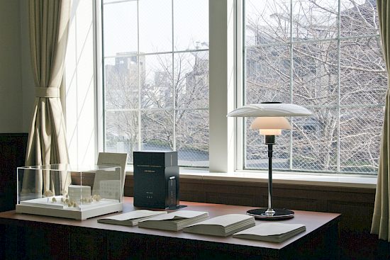 Das Modell PH 4½-3½ Glas-Tischleuchte gehört zur 30 Modelle umfassenden Serie mit 3 teiligem Schirm. Es ging Poul Henningsen nicht nur um die Konzeption einer Leuchte, sondern eines ganzen Systems, aus dem im Laufe der Jahre etwa tausend Modelle hervorgingen. Poul Henningsen war der Erste, der sich auf wissenschaftlicher Basis mit dem Licht befasste und hierzu die logarithmische Spirale nutzte. Mit ihrer Hilfe und durch den Einsatz von Glas erzielte er eine gleichmässige Verteilung des Lichts und eine diffuse Reflexion, d. h. Blendeffekte und Schattenwirkung liessen sich nach Wunsch beeinflussen. Durch die einzelnen Schirmelemente wird die Helligkeit gleichmässig gedämpft. Die Zahlenangaben bei der Modellbezeichnung beziehen sich auf die Grösse der Schirmsegmente. Das Modell PH 4½-3½ Glastischleuchte besteht jedoch aus einem oberen Segment von 45 cm Durchmesser und zwei kleineren darunter, die vom Modell 3½ stammen.