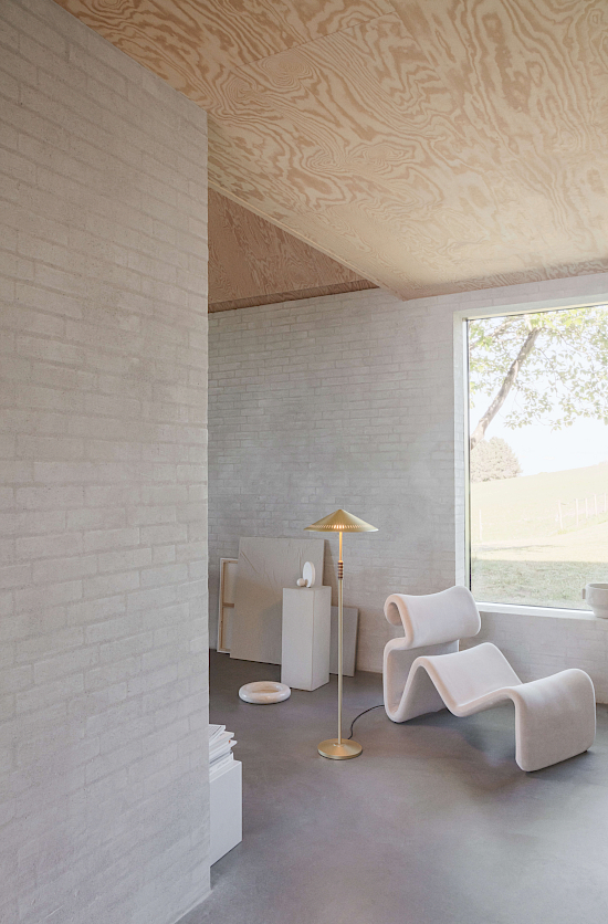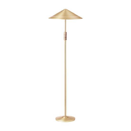 Governor strahlt aus seinen beiden Lichtquellen ein funktionales und blendfreies Downlight aus. Der perforierte Schirm lässt dekorative Lichtreflexe entweichen und beleuchtet gleichzeitig dezent die Messingoberfläche, wenn das Licht eingeschaltet ist. In Kombination mit seinen warmen Materialien schafft die Stehleuchte eine gemütliche Atmosphäre im Raum.