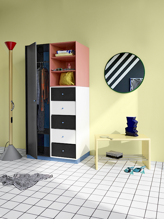 - Komponenten (Aufhängung, Beine, Sockel, Rollen, Tablare, Türen, Schubladen, Beleuchtung) auswählen und Positionen festlegen