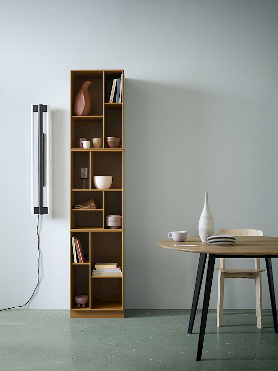LOOM ist ein hohes Bücherregal, das vielfältige Aufbewahrungsmöglichkeiten für Bücher und andere Gegenstände im Wohnzimmer oder Arbeitszimmer bietet. Es handelt sich um ein schmales Regal mit zahlreichen Fächern in unterschiedlichen Grössen, die eine elegante Präsentation der Gegenstände ermöglichen. Das schmale Design ermöglicht die Nutzung in sowohl kleinen als auch grösseren Räumen. Das Regal kann beliebig erweitert werden. Es ist mit Aufhängeschienen oder Sockeln erhältlich und kann in allen 41 Lackfarben von Montana gestaltet werden.