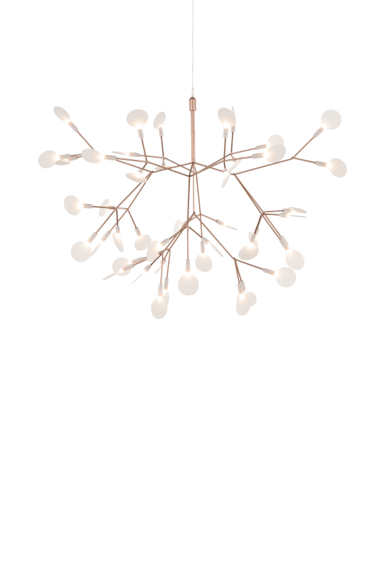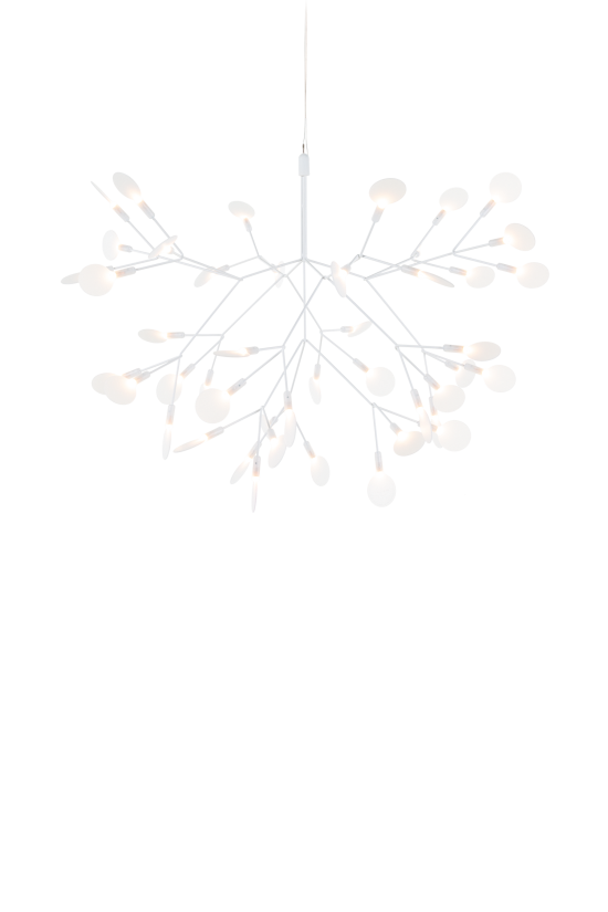 Inspiriert von der zarten Schönheit der Heracleum-Pflanze, ist Heracleum III Suspended von Bertjan Pot eine meisterhafte Verschmelzung von Natur und Technologie. Schlanke Zweige beleuchten weisse, blattförmige Linsen, die mit der Electrosandwich®-Technologie von Marcel Wanders Studio betrieben werden. Ihre organische, immerwährende Blüte strahlt Eleganz und Innovation aus und macht jeden Raum aussergewöhnlich. Die aufsehenerregende Pendelleuchte besteht aus einem verzweigten Metallrahmen mit dünnen, handgefertigten Ästen, die in Weiss, Kupfer, Nickel oder Grün erhältlich sind. An den Enden sitzen drehbare, linsenförmige Polycarbonat-Diffusoren, die wir kleine Blätter wirken und das Licht sanft streuen. Die Blütenblätter schwingen an beiden Seiten leicht nach oben, was die Leuchte ideal für lange, rechteckige Flächen oder auch runde Tische und Bereiche macht.