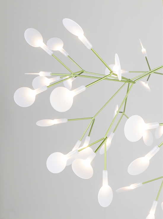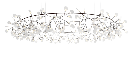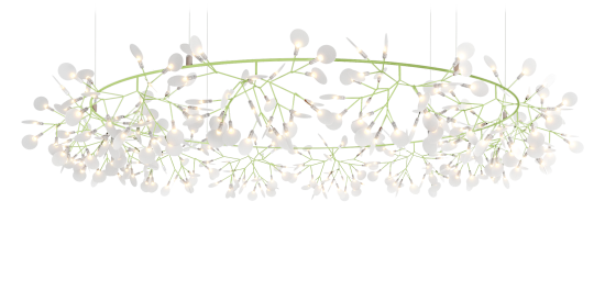 The Big O by Bertjan Pot ist eine strahlende, kreisförmige Blüte, die den Raum mit Eleganz krönt. Inspiriert von den Kronen der Macht und der Ewigkeit, bringen seine schlanken Äste und blattförmigen Linsen die Schönheit der Natur in die Innenräume. Die mit Electrosandwich® von Marcel Wanders Studio betriebene Leuchte ist in zwei Grössen und vier Farben erhältlich und funktioniert mit dem Wireless Wall Switch. Die aufsehenerregende Pendelleuchte besteht aus einem runden und jeweils verzweigten Metallrahmen mit dünnen, handgefertigten Ästen, die in Weiss, Kupfer, Nickel oder Grün erhältlich sind. An den Ästen sitzen drehbare, linsenförmige Polycarbonat-Diffusoren, die wir kleine Blätter wirken und das Licht sanft streuen. Die Blütenblätter schwingen an beiden Seiten leicht nach oben, was die Leuchte ideal für lange, rechteckige Flächen macht.