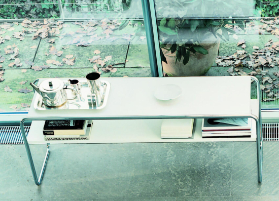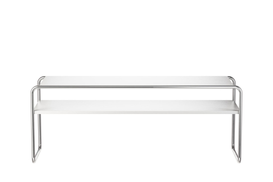 Der B 10/1 Beistelltisch, entworfen von Marcel Breuer in den 1920er Jahren für Thonet, ist ein raffiniertes Stück aus der Bauhaus-Zeit, das mit seiner offenen, reduzierten Form den Raum leicht wirken lässt. Sein Gestell aus gebogenem Stahlrohr, verchromt oder pulverbeschichtet, trägt eine rechteckige Platte und ein Tablar aus lackiertem Holz oder Glas. Breuer hat ihn so gedacht, dass er neben Sofas oder Sesseln steht und praktisch ist, ohne zu dominieren – super für Wohnzimmer, Loungebereiche oder Büros. Es ist der Beistelltisch, der nicht viel Platz braucht, aber immer nützlich ist. Ein Stück Bauhaus-Geschichte, das praktisch ist und elegant wirkt.