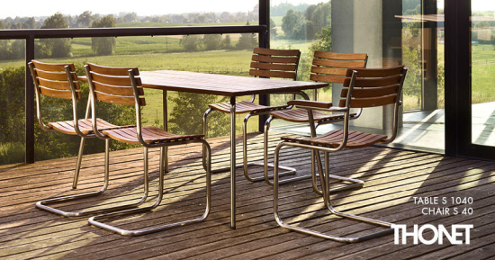 Der S 1040 Tisch vom Thonet Design Team aus dem Jahr 1999 ist ein bewährter, wetterfester Outdoor-Tisch, der sich für Terrassen, Balkone oder Gärten wirklich eignet. Die Platte besteht aus massivem Iroko-Holz (afrikanisches Teak), das von Natur aus extrem witterungsbeständig und fäulnisresistent ist. Es hat eine warme, goldbraune Farbe. Das Gestell aus Edelstahl ist rostfrei und stabil. Der Gartentisch ist so konstruiert, dass er Wind und Wetter standhält und die hohe Ölhaltigkeit des Iroko-Holzes sorgt dafür, dass die Tischplatte auch nach Jahren noch schön aussieht. Er ist perfekt für private Terrassen, Gastronomie oder Hotels, tut einfach seinen Dienst und wird mit der Zeit immer charmanter.