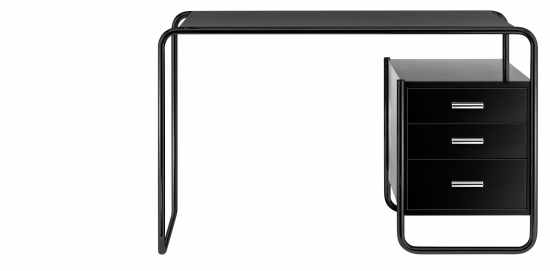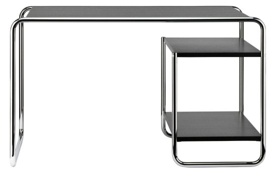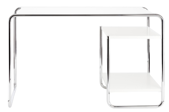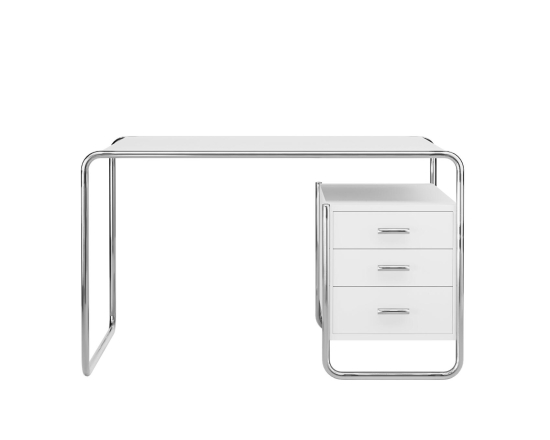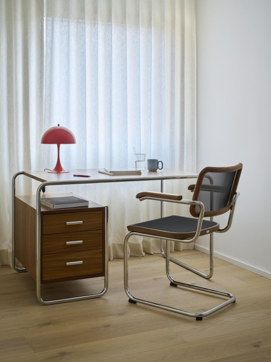 Der S 285/2 Schreibtisch, entworfen von Marcel Breuer im Jahr 1935 für Thonet, ist ein echter Bauhaus-Klassiker, der Stahlrohr und Holz auf eine Weise kombiniert, dass die Holzelemente wie schwebend wirken. Sein Gestell aus gebogenem, verchromtem Stahlrohr trägt eine Platte aus lackiertem oder furniertem Holz, und die Aufbewahrungselemente – Schubladen oder Tablare – sind so eingefügt, dass alles leicht und offen aussieht. Breuer hat ihn so konzipiert, dass er extrem kompakt ist und trotzdem genug Platz bietet, perfekt für Home-Offices oder Arbeitszimmer, wo er modern und funktional bleibt. Die verschiedenen Varianten mit einem oder zwei Korpusselementen lassen sich spiegelbildlich anordnen, und Thonet fertigt ihn mit hochwertigen Materialien, die langlebig sind und eine schöne Patina bekommen. Ein Schreibtisch, der die "Neue Sachlichkeit" verkörpert und heute noch so aktuell ist wie damals.
