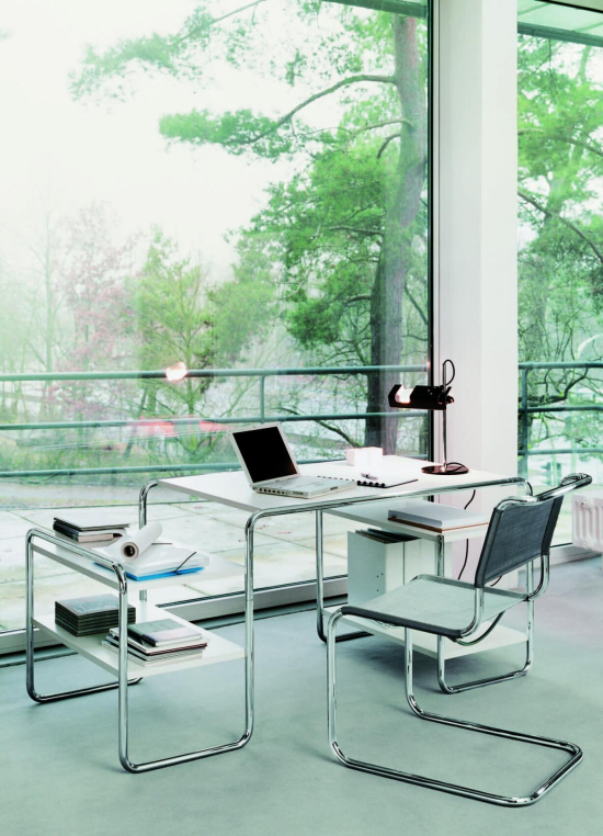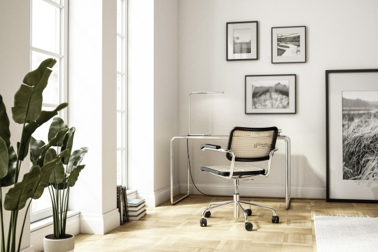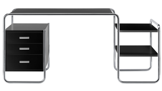 Der S 285 Schreibtisch, entworfen von Marcel Breuer im Jahr 1935 für Thonet, ist ein echter Bauhaus-Klassiker, der Stahlrohr und Holz auf eine Weise kombiniert, dass die Holzelemente wie schwebend wirken. Sein Gestell aus gebogenem, verchromtem Stahlrohr trägt eine Platte aus lackiertem oder furniertem Holz, und die Aufbewahrungselemente – Schubladen oder Tablare – sind so eingefügt, dass alles leicht und offen aussieht. Breuer hat ihn so konzipiert, dass er kompakt ist und trotzdem genug Platz bietet, perfekt für Home-Offices oder Arbeitszimmer, wo er modern und funktional bleibt. Die verschiedenen Varianten mit einem oder zwei Korpusselementen lassen sich spiegelbildlich anordnen, und Thonet fertigt ihn mit hochwertigen Materialien, die langlebig sind und eine schöne Patina bekommen. Ein Schreibtisch, der die "Neue Sachlichkeit" verkörpert und heute noch so aktuell ist wie damals.