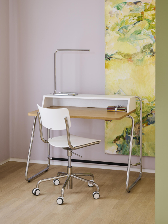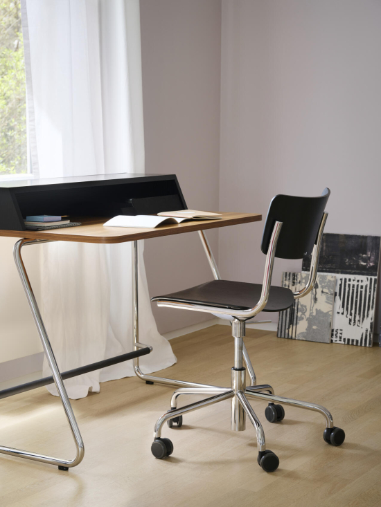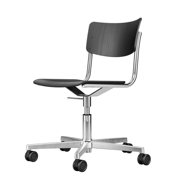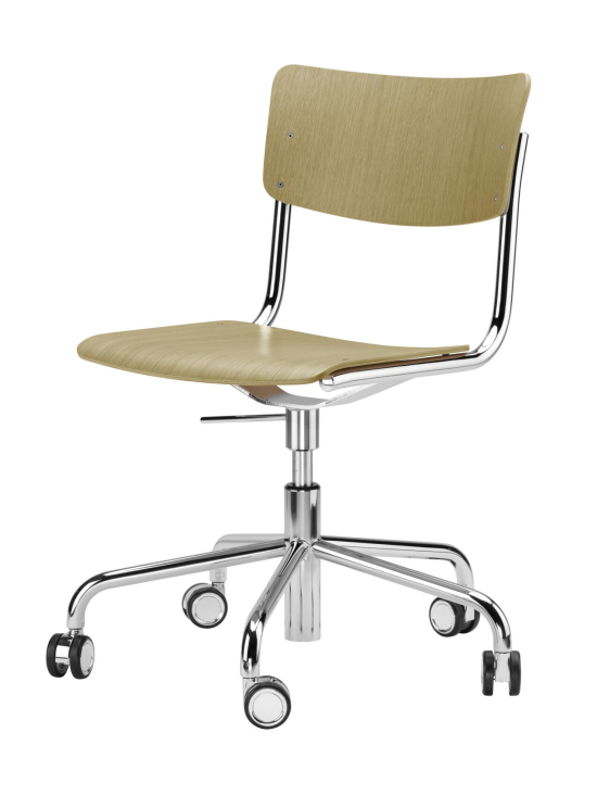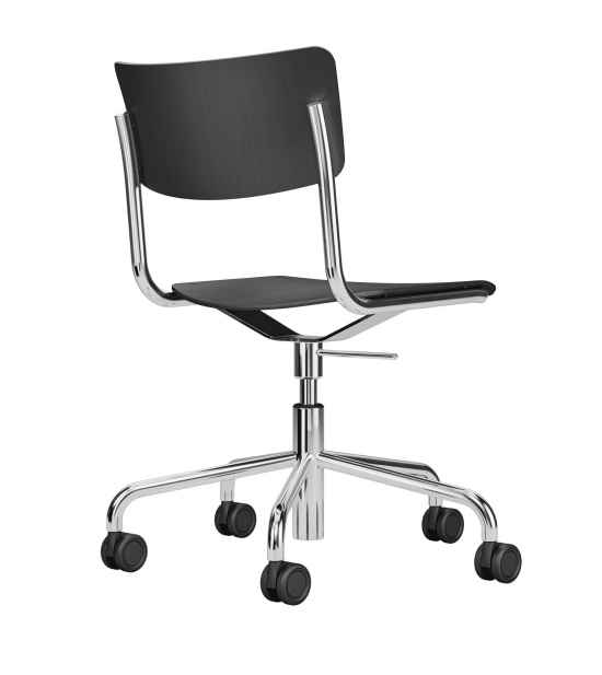 Der S 43 DR Drehstuhl, eine Variante des klassischen S 43 Freischwingers von Mart Stam aus den 1930er Jahren, ist ein moderner Alleskönner, der den Originalgeist mit praktischer Drehfunktion aufpeppt. Seine filigrane Sitz- und Rückenlehne aus gefragtem Sperrholz sitzt auf einem verchromten oder pulverbeschichteten Stahlrohrgestell, das sich leicht dreht und den Stuhl flexibel macht. Ohne Armlehnen bleibt er leicht und offen, was ihn ideal für Büros, Homeoffices oder Essbereiche macht, wo man mal schnell drehen und greifen muss. Es ist der Stuhl, der die Moderne einfängt, ohne kompliziert zu sein – Thonet hat ihn so gebaut, dass er hält und eine coole Patina kriegt. Ein Stück, das Geschichte hat, aber perfekt im Alltag funktioniert.