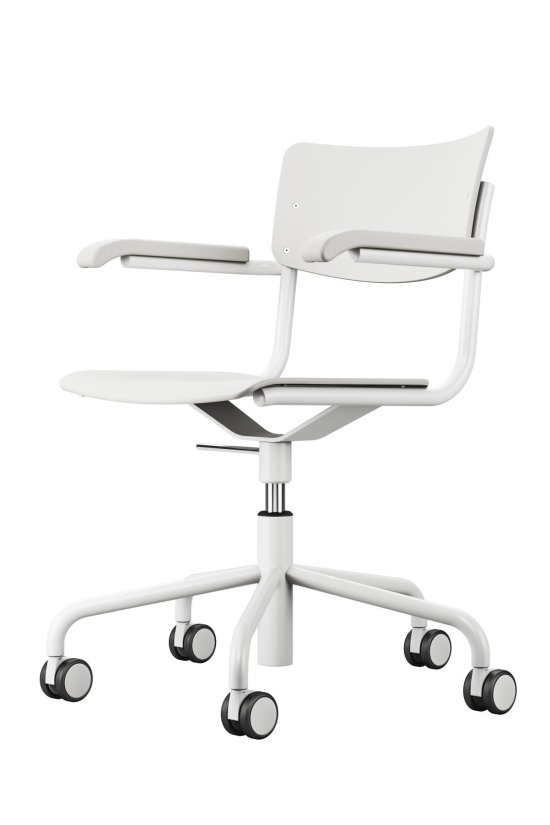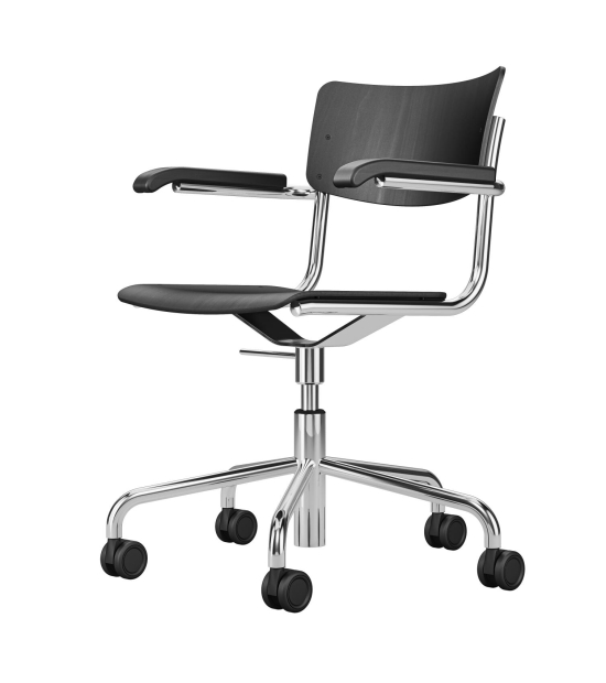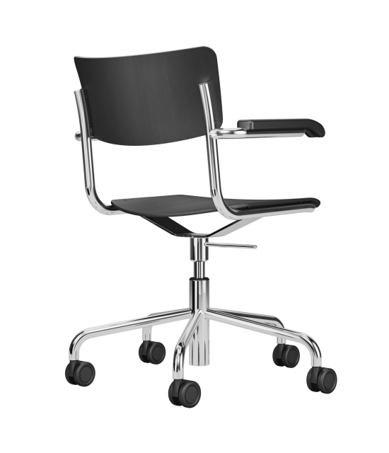 Der S 43 FDR Drehstuhl, eine Variante des klassischen S 43 Freischwingers von Mart Stam aus den 1930er Jahren, ist ein moderner Alleskönner, der den Originalgeist mit praktischer Drehfunktion aufpeppt. Seine filigrane Sitz- und Rückenlehne aus gefragtem Sperrholz und die Massivholz-Armlehnen sitzen auf einem verchromten oder pulverbeschichteten Stahlrohrgestell, das sich leicht dreht und den Stuhl flexibel macht. Auch mit Armlehnen bleibt er leicht und offen, was ihn ideal für Büros, Homeoffices oder Essbereiche macht, wo man mal schnell drehen und greifen muss. Es ist der Stuhl, der die Moderne einfängt, ohne kompliziert zu sein – Thonet hat ihn so gebaut, dass er hält und eine coole Patina kriegt. Ein Stück, das Geschichte hat, aber perfekt im Alltag funktioniert.