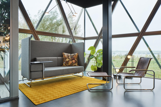 Inspiriert von der zunehmenden Verschmelzung von Arbeits- und Wohnbereichen wurde es 2020 von Studio Irvine weiterentwickelt, so dass es in den modernen Kontext von New Work passt. In den Sitzrahmen lassen sich je nach Bedarf baugleiche Arm- und Rückenlehnen oder Trennwände als Sicht- und Lärmschutz integrieren. Dadurch ist es vielfältig erweiterbar und findet dank variabler Seitenpaneele auch in Multi-Space-Bürokonzepten seinen Platz. Die Paneele bilden den Rahmen für unterschiedliche Kissen, die lose aufgelegt werden. Zudem können Anbautische montiert werden.