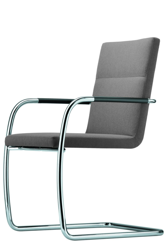 Der S 61 V Freischwinger mit hoher Rückenlehne, entworfen von Glen Oliver Löw im Jahr 2001 für Thonet, ist ein Stuhl, der den alten Freischwinger neu aufleben lässt – elegant, leicht und wunderbar bequem. Seine Sitzschale aus geformtem Holz mit Komfort-Vollumpolsterung verbindet sich über die Armlehnen mit dem Stahlrohrgestell, das verchromt oder pulverbeschichtet ist, und schwingt sanft, wenn man sich bewegt. Die ummantelten Armlehnen verjüngen sich nach hinten und alles zusammen ergibt ein filigranes, schwebendes Ganzes. Der Stuhl mit hohem Rücken ist schnörkellos klar und passt er ideal in hochwertige Esszimmer, moderne Büros oder zeitlose Cafés, wo er den Raum nicht belastet. Ein zurückhaltendes Design, das sich natürlich anfühlt.