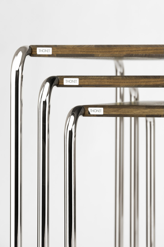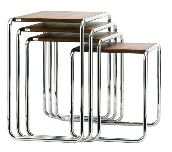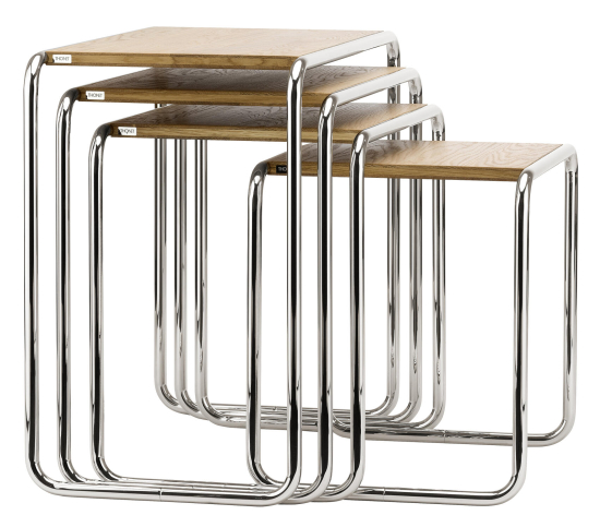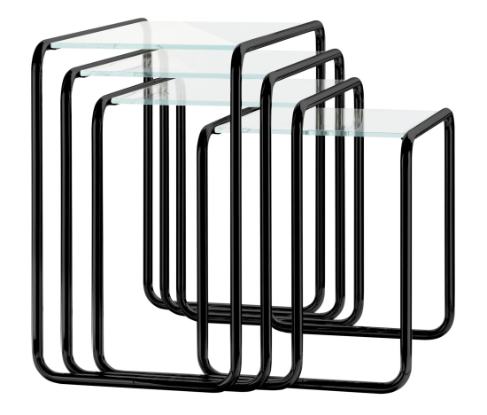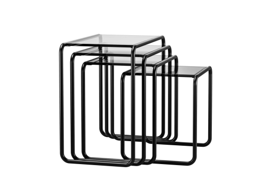 Das SET B 9 Beistell-Satztisch von Marcel Breuer aus den 1920er Jahren für Thonet ist ein echter Bauhaus-Klassiker, der mit seiner puristischen Form und dem gebogenen Stahlrohrgestell beeindruckt. Das Set besteht aus vier Tischen in unterschiedlichen Grössen, die sich perfekt ineinander schieben lassen, um Platz zu sparen, und einzeln als Beistelltisch, Ablage oder für Deko genutzt werden können. Die Platten aus lackiertem MDF oder Glas, das Gestell verchromt oder pulverbeschichtet, machen es leicht und vielseitig für Wohnzimmer, Sitzgruppen oder Büros. Breuer hat es ursprünglich für die Bauhaus-Kantine entworfen, und Thonet produziert es so, dass es hält und eine schöne Patina kriegt. Ein Set, das praktisch ist und trotzdem elegant wirkt, ohne viel Aufhebens.