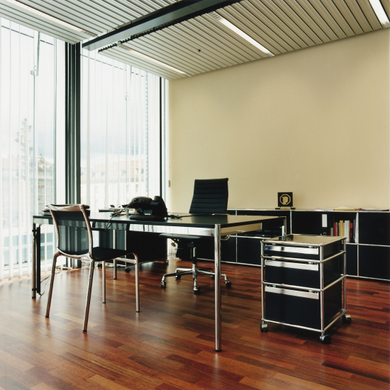 Der QS M63 Rollcontainer von USM Haller ist ein praktisches, hochwertiges Möbelstück, das sich problemlos in jeden Einrichtungsstil einfügt. Mit drei Schubladen in verschiedener Höhe bietet er ausreichend Stauraum für Ordner, Schreibzeug oder persönliche Utensilien – ideal unter dem Schreibtisch im Homeoffice oder im Büro. Das Gegengewicht sorgt für sicheren Stand, auch bei voller Beladung, und die Rollen machen ihn flexibel verschiebbar. Zwei Rollen sind arretierbar. Das Gestell aus verchromtem Stahl ist stabil und zeitlos, die Schubladen sind präzise eingepasst und leicht zu öffnen. Ein Rollcontainer, der einfach funktioniert und mit seiner klaren Form jeden Arbeitsplatz aufwertet.