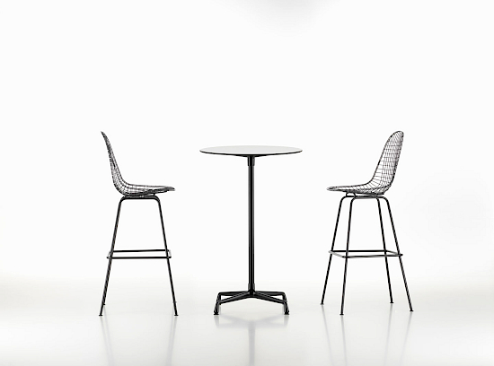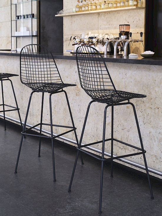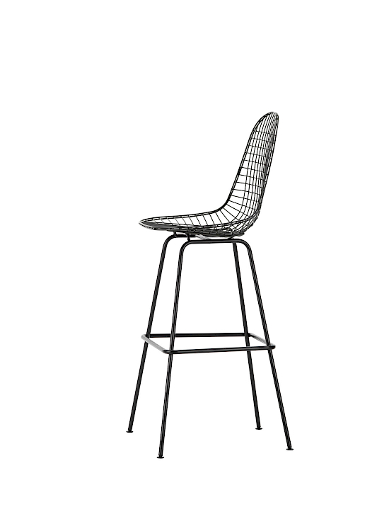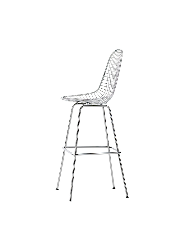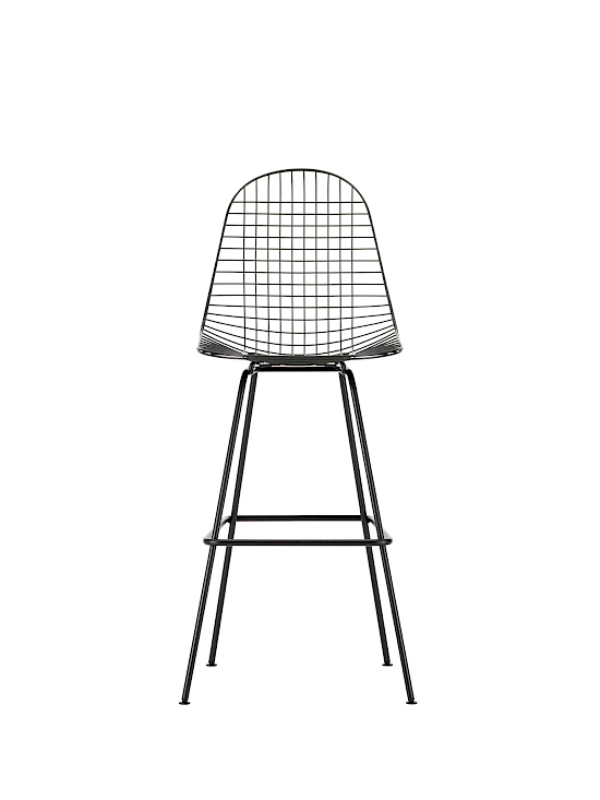 Die Verwendung von Stahldraht hatte sich für Charles & Ray Eames bereits für verschiedene Untergestelle der Fiberglass-Schalensitze und für die Unterkonstruktion von Tischen bewährt. Die filigrane Transparenz und optische Leichtigkeit bei hoher Belastbarkeit sollten nun auch auf die Schalenkonstruktion übertragen werden. Ein orthogonaler Aufbau, die Schweisspunkttechnik und das Einfassen der Drähte am Rand zwischen zwei stärkeren Drähten ermöglichten eine stabile Schalenform. Durch die Verwendung nur eines Materials erhält der Wire Chair sein ganzheitliches Aussehen. Das Vierbeinuntergestell der Eames Wire Stools gibt es in den zwei Höhen Medium für typische Küchenbars und High für Stehtische. Es ist mit einer Fussstütze versehen und entweder verchromt oder schwarz pulverbeschichtet. Die Wire Stools gibt es ungepolstert, mit einem Sitzkissen oder mit Sitz- und Rückenpolstern ausgestattet. Letztere werden aufgrund ihrer Form auch als «Bikini» bezeichnet. Ohne Polster eignen sich die Wire Stools für den Einsatz im Freien.