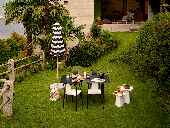 | Tischplatte und Untergestell Outdoor | umgeformtes und geschweisstes Stahlblech, verzinkt oder unterverzinkt und pulverbeschichtet mit Feinstruktur, die Oberfläche der verzinkten Variante ist unregelmässig geschliff en. |