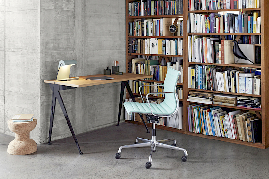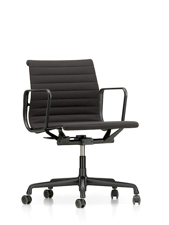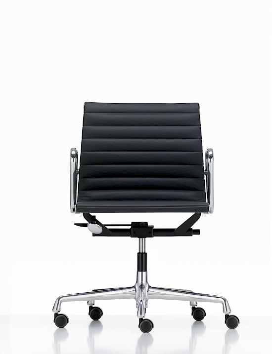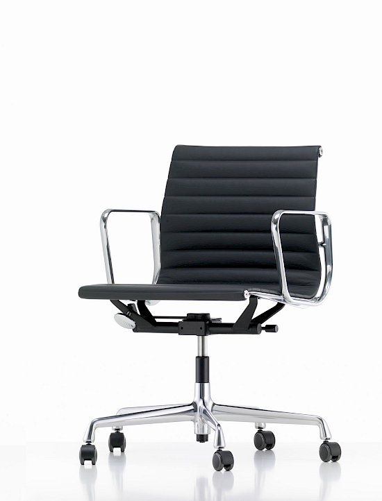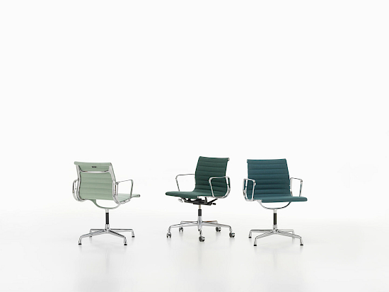 Die Modelle EA 117, EA 118 und EA 119 sind die Bürodrehstühle in der Stuhlfamilie Aluminium Group von Charles und Ray Eames, und mit ihrer ikonischen Form eignen sie sich ideal für repräsentative Büros. Sie sind mit einer auf das Nutzergewicht einstellbaren Kippmechanik ausgestattet, die für guten Komfort sorgt. Dank der Bezüge in einer Vielzahl von Farben lässt sich für jede Büroumgebung der passende Stuhl finden. Der EA 117 und der EA 118 unterscheiden sich vom EA 119 durch eine niedrigere Rückenlehne, der EA 118 ist zudem etwas schmaler und seine Sitzposition ist stärker tischorientiert als diejenige der beiden anderen Modelle.