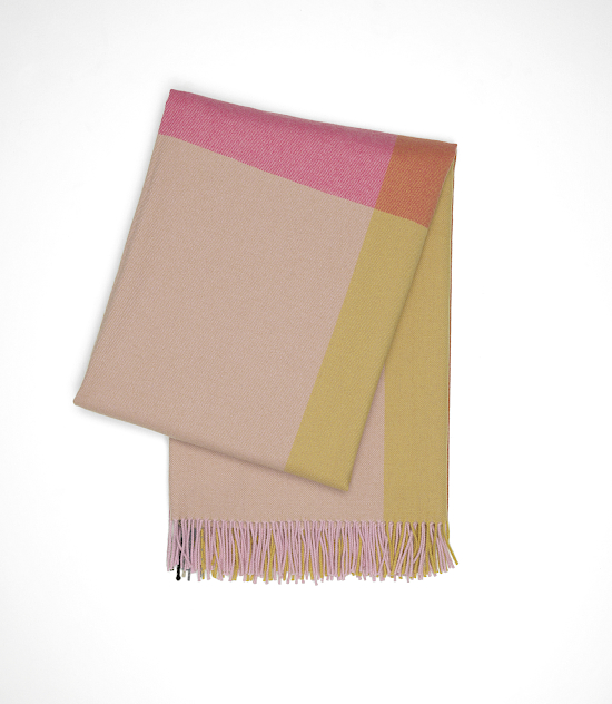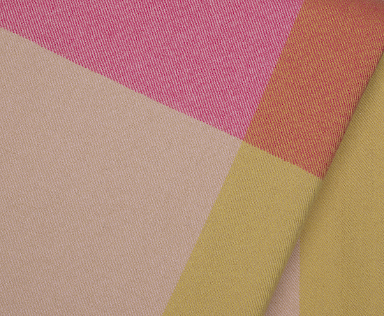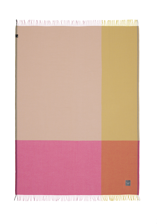Mit den Colour Block Blankets zeigt die niederländische Designerin Hella Jongerius exemplarisch auf, welchen Effekt die Komposition von Kett- und Schussfaden im Webverfahren auf die Farbzusammenstellung hat. Vier farblich mehr oder weniger intensiv kontrastierende Felder formen im Zusammenspiel ein dekoratives Gesamtmuster. Die jeweilige Mischung der zwei Fadenfarben lässt sich an den Rändern der Decken ablesen: Auf der kurzen Seite an den Farben der Fransen, auf der langen Seite an der sichtbaren Webkante mit eingewebten Farbstreifen. Die Colour Block Blankets bestehen aus peruanischer Hochlandwolle. Sie stammt von Schafen aus einer Kreuzung des Merinoschafes mit seiner extrem weichen Wolle und des Corriedale-Schafes, das für seine robuste Wolle bekannt ist.