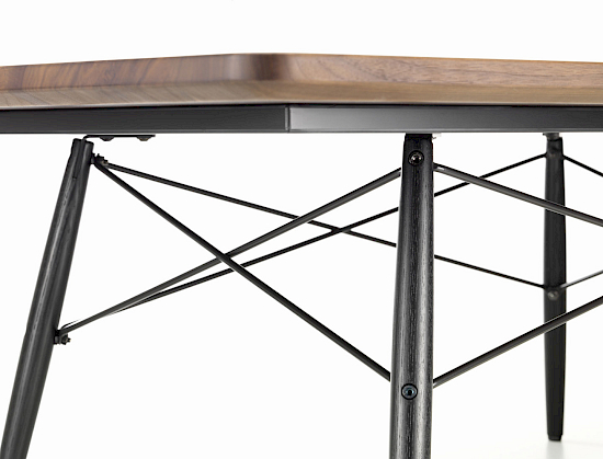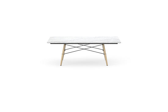 Charles und Ray Eames haben im Jahr 1949 einen Couchtisch als Einzelstück für ihr legendäres Eames House in Pacific Palisades bei Los Angeles entworfen. Dort prägt er bis heute das einzigartige, historische Interieur. Die rechteckige Platte dieses einfach und gleichzeitig luxuriös wirkenden Tisches war mit Blattgold überzogen und seine «Dowel-leg-base» eine Abwandlung des Holzuntergestells, das bei den Eames Plastic Chairs eingesetzt wird. In den Folgejahren fertigten Charles und Ray zwei weitere dieser Tische, einen mit Marmor- und einen mit Holztischplatte.