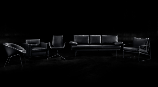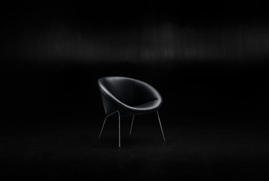 Die Black Edition reduziert den 369 auf eine konsequent monochrome Lesart: Stahlgestell matt pulverbeschichtet schwarz, Aussenschale formgeschäumt in mattem Kunststoff schwarz, bezogen in Leder Classic black. Alle Teile folgen derselben Farbsprache, ohne den Schwung der Schalenform aufzugeben.