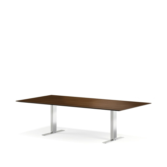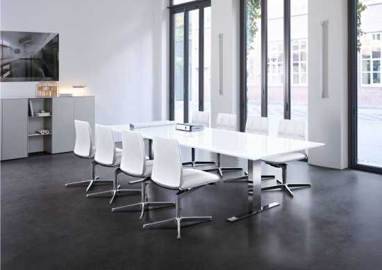 Der Exec-V Besprechungstisch übernimmt die gestalterische Sprache des Schreibtischprogramms und überträgt sie in den Konferenzraum. Die Formvielfalt bietet für jeden Raum den optimalen Tisch: Neben der klassischen Rechteckform stehen runde und quadratische Varianten zur Wahl, die jeweils unterschiedliche Kommunikationssituationen begünstigen. Rechteckige Tische werden mit T-Fuss ausgeführt, runde und quadratische mit einem Säulenfuss. Bei Bedarf ist eine motorische Höhenverstellung lieferbar, was auch Besprechungen im Stehen erlaubt. Integrierte Steckdosen in der Kabelwanne sorgen für eine saubere Elektrifizierung.